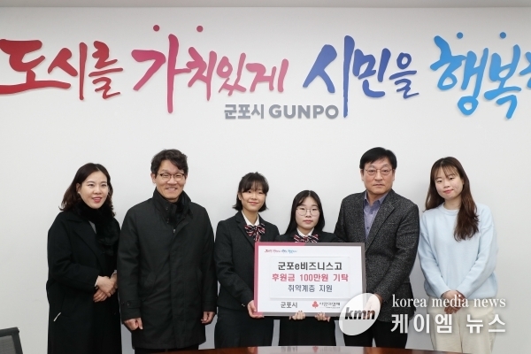 (케이엠뉴스) 22일 군포e비즈니스고등학교 청소년 비즈쿨 동아리는 수익금 100만원을 군포시에 기탁했다.