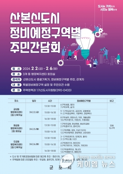 (케이엠뉴스) 군포시는 2월 2일부터 6일까지 평일 3일간 궁내동, 재궁동, 오금동 행정복지센터에서 노후계획도시 정비 특별법 제정에 따른 내용 설명 및 정비예정구역 설정 등에 대한 주민의견을 수렴하는 간담회를 실시한다.