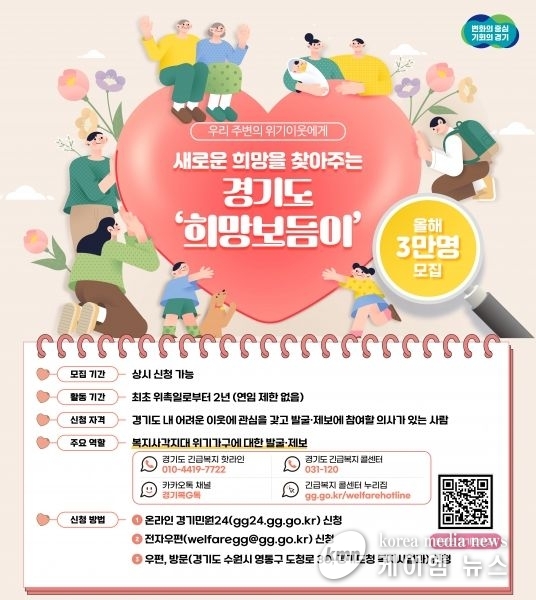 (케이엠뉴스) 경기도가 복지사각지대에 놓인 이웃을 제보할 ‘경기도 희망보듬이’를 작년 1만명 모집에서 올해 3만명까지 확대한다고 4일 밝혔다.