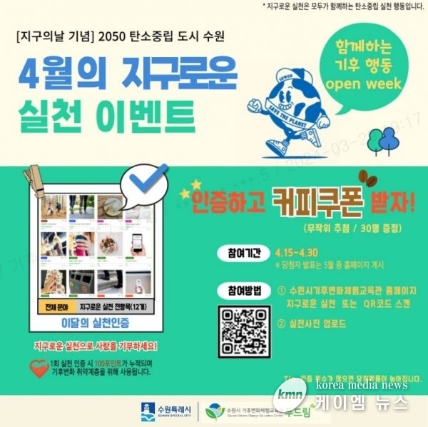 (케이엠뉴스) 수원시 기후변화체험교육관 두드림이 지구의 날을 맞아 15일부터 30일까지 수원시민을 대상으로 ‘탄소중립실천 인증 챌린지’를 진행한다.
