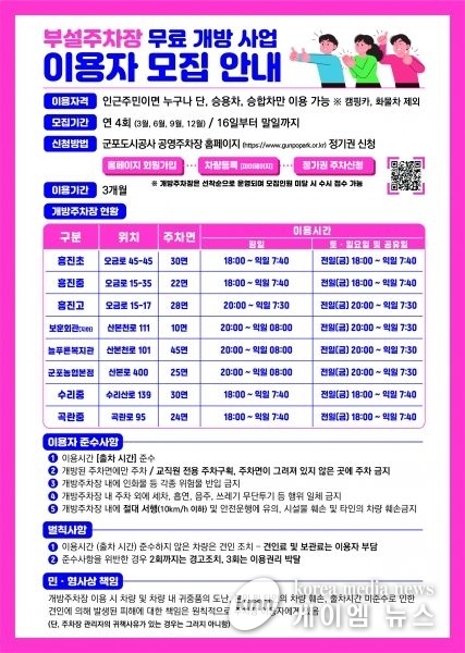 개방하는 주차공간은 수리중학교 30면, 곡란중학교 24면 모두 54면으로 4월 16일부터 28일까지 군포도시공사 공영주차장 홈페이지를 통해 선착순으로 신청을 받는다.