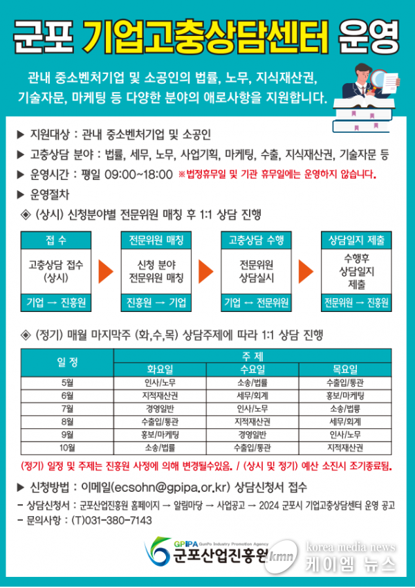 (케이엠뉴스) 군포산업진흥원은 군포시 소재 중소벤처기업 및 소공인 기업을 대상으로 경영, 기술, 마케팅 등 기업 애로해결을 위한 기업고충상담센터를 상시 운영하고 있다.