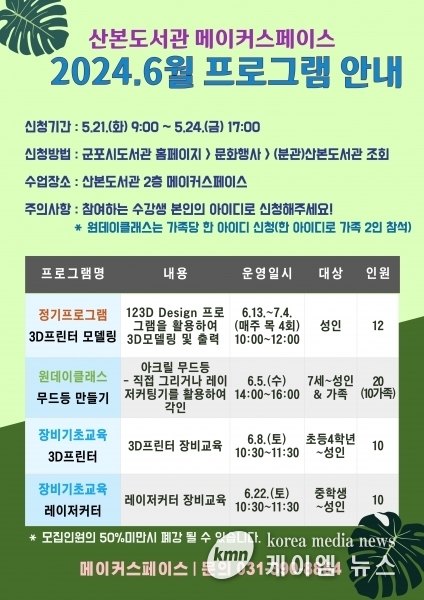 (케이엠뉴스) 군포시 산본도서관은 오는 21일부터 메이커스페이스 6월 프로그램 수강생을 모집한다.
