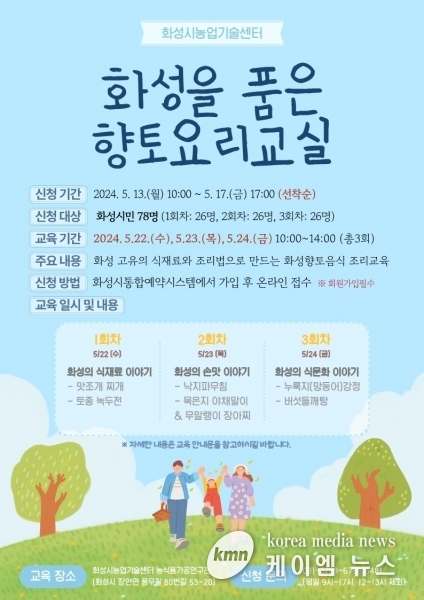 (케이엠뉴스) 화성시가 건강한 식문화 형성과 화성의 향토 음식을 확산 보급을 위한 향토요리교실을 운영한다.