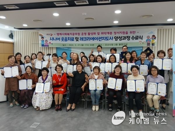 (케이엠뉴스) 오산시는 27일 명예사회복지공무원 39명이 참석한 가운데 ‘시니어 웃음치료 및 레크리에이션지도사 양성과정’ 수료식을 개최했다고 밝혔다.