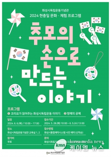 (케이엠뉴스) 화성시 독립운동기념관에서 다음달 6일 현충일을 맞아 순국선열의 숭고한 가치를 되새기기 위해 문화·체험 프로그램 ‘추모의 손으로 만드는 이야기’를 운영한다.