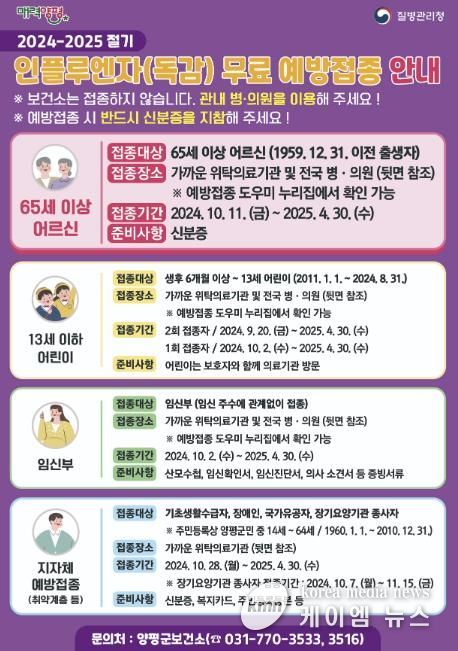 (케이엠뉴스) 양평군은 20일부터 어린이 독감 예방접종을 시작으로, 순차적으로 무료 예방접종을 실시한다고 밝혔다.