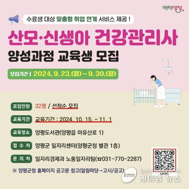 (케이엠뉴스) 양평군이 2024년 취업지원 프로그램 ‘산모·신생아 건강관리사’ 하반기 교육생을 모집한다.