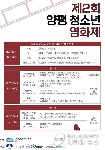 (케이엠뉴스) 양평군청소년문화의집은 오는 19일 양평군청 앞 애외 특설행사장과 양평시네마에서 ‘제2회 양평청소년영화제’를 개막한다고 밝혔다.