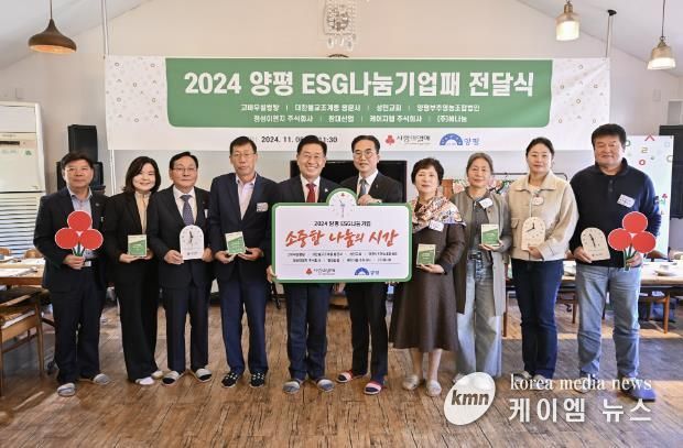 (케이엠뉴스) 양평군은 경기사회복지공동모금회와 6일 지역의 어려운 이웃들을 돕기 위해 나눔을 실천한 기업을 대상으로 ESG나눔기업패 전달식을 가졌다.