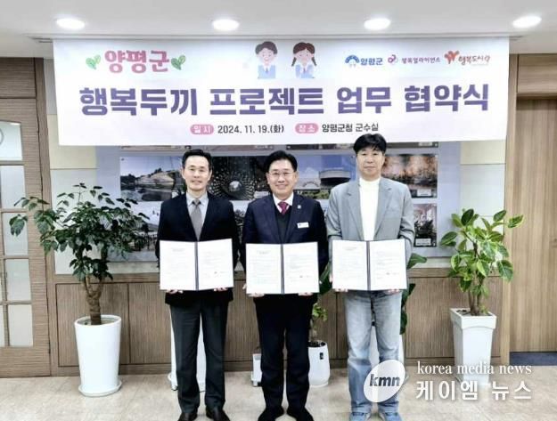 (케이엠뉴스) 양평군은 지난 19일 군수 집무실에서 행복얼라이언스(사무국 행복나래(주)), 행복도시락 사회적협동조합과 ‘행복두끼 프로젝트’ 업무 협약을 체결했다.