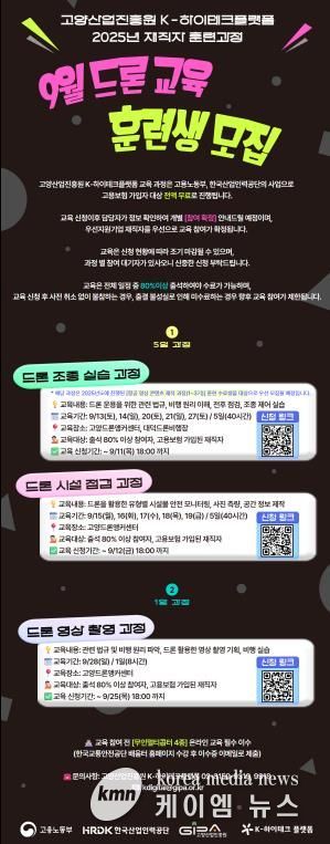 (케이엠뉴스) 고양산업진흥원 K-하이테크 플랫폼 지원단이 고용노동부와 한국산업인력공단이 주관하는 국가인적자원개발 컨소시엄 사업의 일환으로, 고용보험 가입 재직자 대상 ‘9월 드론 교육’ 훈련생을 모집한다.