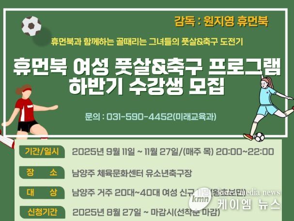 (케이엠뉴스) 남양주시는 오는 9월 11일부터 11월까지 매주 목요일 남양주체육문화센터에서 ‘휴먼북 여성 풋살&축구 강좌’를 운영한다고 밝혔다.