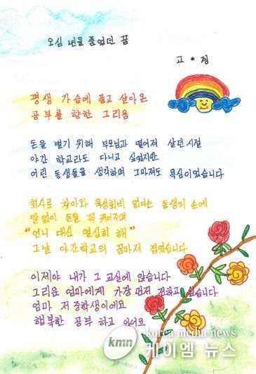 엽서부문에서는 ▲최우수상 봉*순(명자에게, 원당종합사회복지관)▲우수상 박*순(하늘에 계신 아버지, 덕양행신종합사회복지관), 김*순(친구 황순옥에게, 높빛희망학교) 등 4명이 선정됐다.