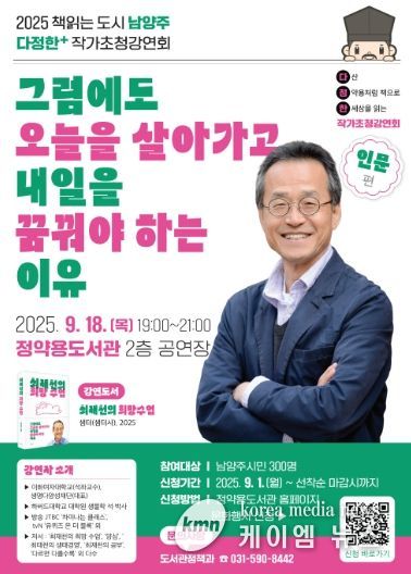 강연은 오후 7시에 시작돼 직장인들도 참여할 수 있으며, 남양주시민 누구나 신청 가능하다. 접수는 9월 1일 오전 10시부터 정약용도서관 누리집 문화행사 신청란을 통해 진행된다.