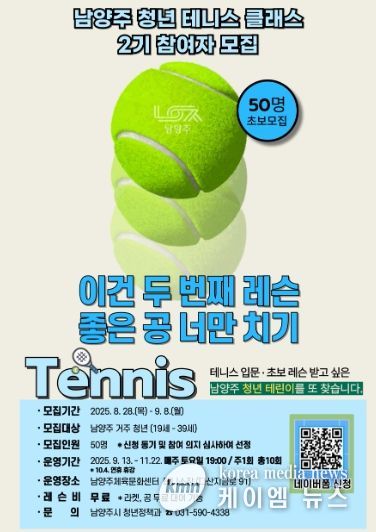 (케이엠뉴스) 남양주시는 오는 28일부터 9월 8일까지 남양주체육문화센터 테니스장에서 진행되는 ‘2025 남양주 청년 테니스 클래스 2기’참여자를 모집한다고 밝혔다.