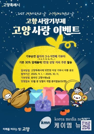 (케이엠뉴스) 고양특례시가 9월 4일 ‘고향사랑의 날’과 10월 1일 ‘고양특례시민의 날’을 기념해 ‘고향사랑기부제 고양사랑 이벤트’를 진행한다고 밝혔다.