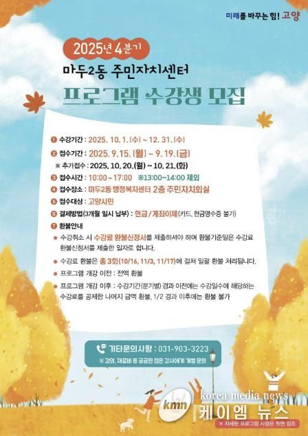 (케이엠뉴스) 고양특례시 일산동구 마두2동 주민자치회가 오는 15일부터 19일까지 5일간 2025년 4분기 문화강좌 프로그램 강좌의 수강생을 모집한다고 밝혔다.