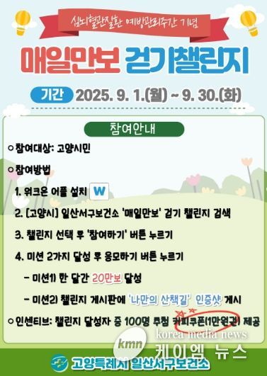 이번 챌린지는 모바일 걷기 앱 ‘워크온(WalkOn)’을 활용해 진행되며, 고양시민의 걷기 실천을 독려하고 심뇌혈관질환 예방 및 건강생활 실천을 지원하기 위해 마련됐다. 참여를 원하는 시민은 워크온 앱 내에서 신청할 수 있다.