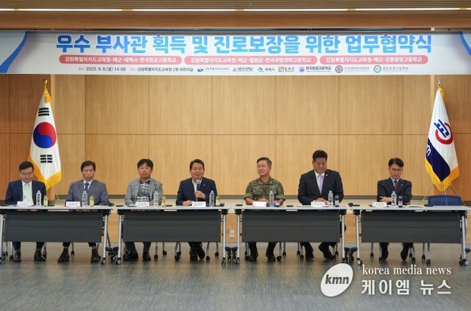 (케이엠뉴스) 강원특별자치도교육청은 9월 8일 14시 본청에서 해군(준장 박태규)·태백시(시장 이상호)·철원군(군수 이현종)·한국항공고(교장 문명호)·한국국방과학고(교장 이창근)·강릉중앙고(교장 고태환)와 해군 부사관 육성을 위한 업무 협약을 체결했다.