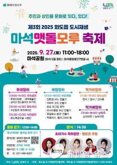 (케이엠뉴스) 남양주시는 오는 27일 화도읍 마석공원에서 ‘제3회 2025 화도읍 도시재생 마석맷돌모루 축제’를 개최한다고 9일 밝혔다.