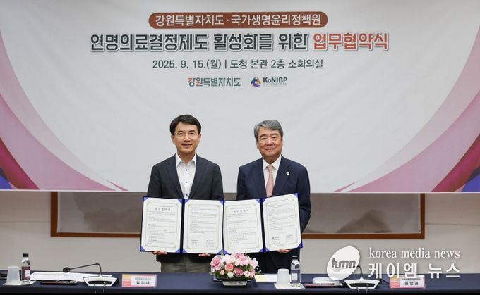 (케이엠뉴스) 강원특별자치도는 9월 15일 오후 2시 30분 본관 소회의실에서 국가생명윤리정책원(원장 홍창권)과 연명의료결정제도 활성화를 위한 업무협약(MOU)을 체결했다.