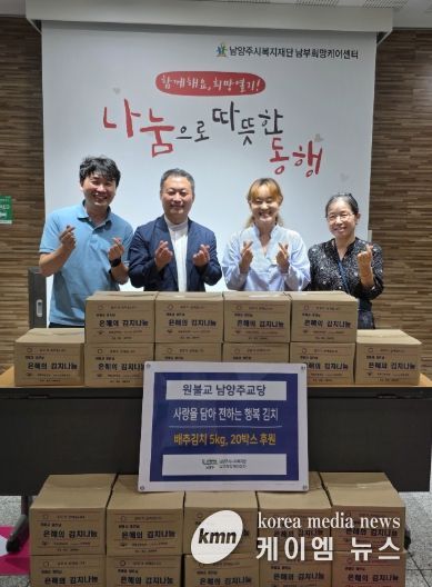 (케이엠뉴스) 남양주시는 지난 17일, 원불교 남양주교당(회장 이수재)이 남부희망케어센터에 금곡동 저소득 가구를 위한 배추김치 5kg 20박스를 기부했다고 19일 밝혔다.