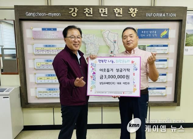 (케이엠뉴스) 성일우레탄㈜ 이민우 대표가 지난 15일 강천면 행정복지센터를 방문하여 관내 소외계층 복지사업을 위한 성금 300만원을 강천면에 기탁했다.