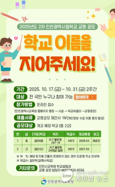 (케이엠뉴스) 인천광역시교육청은 10월 17일부터 31일까지 2주간 신설 중·고교 2곳의 학교명을 공모한다.