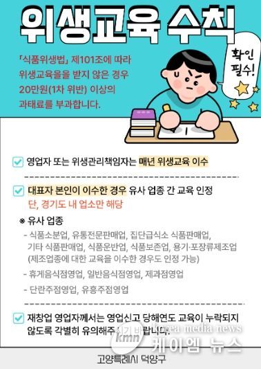 (케이엠뉴스) 고양특례시 덕양구는 11월 한 달간 관내 식품접객업소를 대상으로‘위생교육 집중 독려기간’을 운영하며, 업소 위생 수준 향상과 교육 이수율 제고에 나선다.