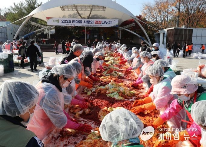 (케이엠뉴스) (사)경기도여성단체협의회 김포시지회가 지난 11일 사우문화체육광장에서 ‘한마음 사랑의 김장나누기’ 행사를 성황리에 개최했다. 행사에 격려하기 위해 참석한 김병수 김포시장은 직접 배추를 버무리며 이웃사랑 실천에 동참하고, 이웃돕기를 위해 헌신하는 여성단체 회원들과 자원봉사자들에게 감사의 뜻을 전했다.