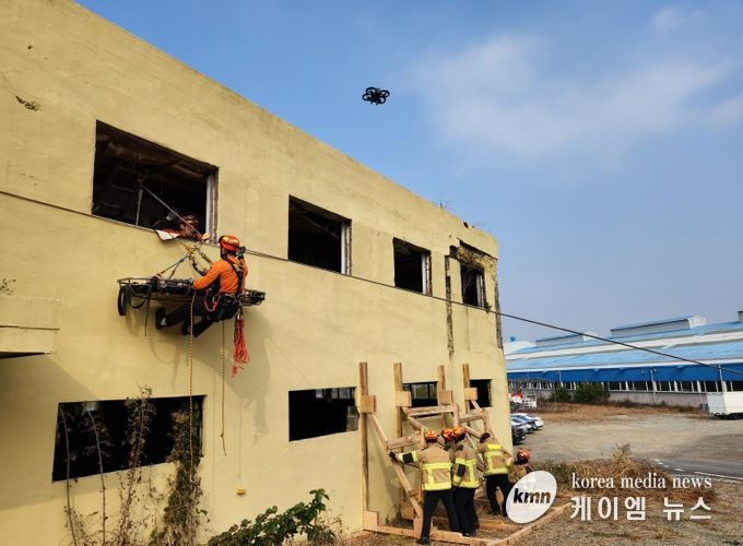 이날 훈련한 주요 내용은 △드론을 활용한 구조 대상자 위치 탐색 △2차 붕괴를 방지하기 위한 목재 지지대 설치 등 구조물 안정화 △퇴로가 차단된 상황에서 로프 시스템을 이용한 들것 구조 등 복합 구조 전술이다.