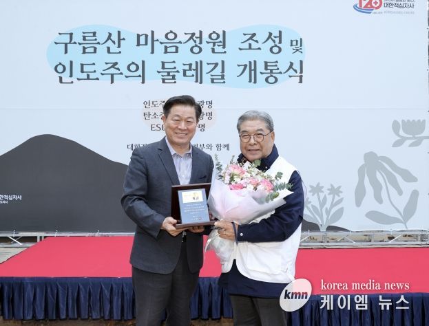 시는 14일 구름산 산림욕장에서 대한적십자사 경기도지사와 함께 개최한 ‘마음정원 조성 및 인도주의길 개통식’에서 이 회장에게 광명시 명예시민증을 수여했다.