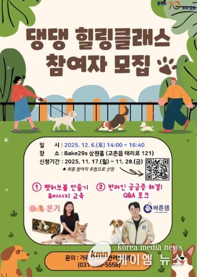 (케이엠뉴스) 김포시는 오는 11월 17일부터 11월 28일까지 반려문화 교육 ‘댕댕 힐링클래스’ 참여자를 모집한다고 밝혔다.