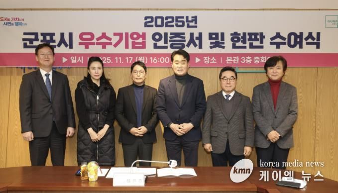 (케이엠뉴스) 군포시는 17일 시청 3층 중회의실에서 ‘2025년 군포시 우수기업 인증서 및 현판 수여식’을 열고 5개 우수기업에 인증서와 현판을 수여했다.