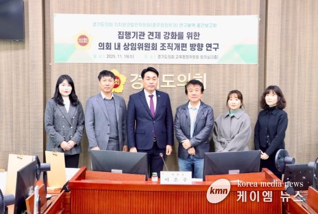 (케이엠뉴스) 경기도의회 자치분권발전위원회 총무행정분과(위원장 이은주)는 11월 19일 도의회 교육행정위원회 회의실에서 '집행기관 견제 강화를 위한 의회 내 상임위원회 조직개편 방향 연구' 중간보고회를 개최하며, 향후 의원 정수 확대와 정책 환경 변화에 대응하기 위한 상임위원회 재구조화 방안을 논의했다.