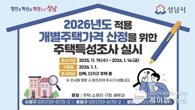 (케이엠뉴스) 성남시는 내년 1월 16일까지 단독·다가구·상가주택을 대상으로 ‘2026년 1월 1일 기준 개별주택가격 산정’을 위한 주택특성조사를 실시한다.