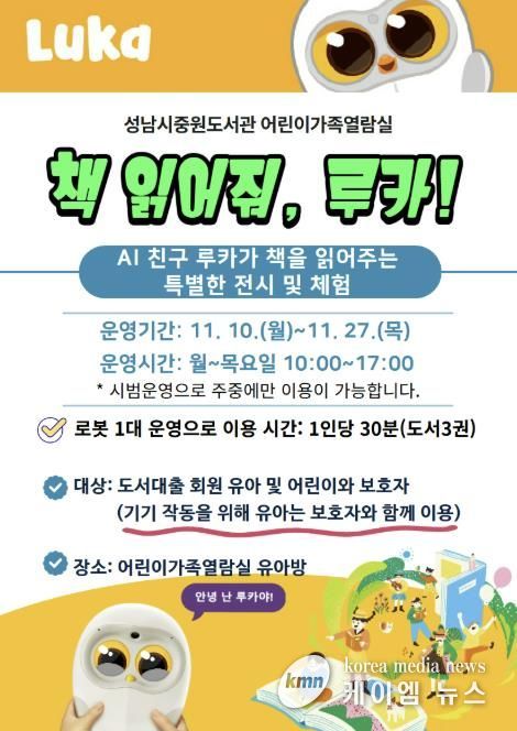 (케이엠뉴스) 성남도시개발공사 중원도서관은 지역 어린이들에게 인공지능(AI) 기술을 활용한 새로운 독서 체험 기회를 제공하기 위해 ‘책 친구 로봇, 루카(LUKA)’를 오는 12월까지 운영한다고 21일 밝혔다.