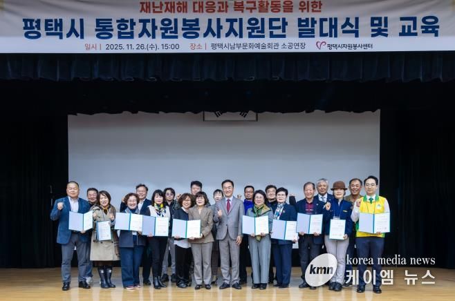 (케이엠뉴스) 평택시는 지난 26일 남부문예회관 소공연장에서 21개 자원봉사 단체가 참여한 가운데 ‘평택시 통합자원봉사지원단’발대식을 개최하고, 대규모 재난 발생 시 신속한 긴급 대응 체계를 본격 가동한다고 밝혔다.