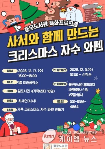 (케이엠뉴스) 김포시 풍무도서관에서 연말을 맞아 ‘사서와 함께 만드는 크리스마스 자수 와펜’을 오는 12월 17일 오후 4시부터 6시까지 운영한다.