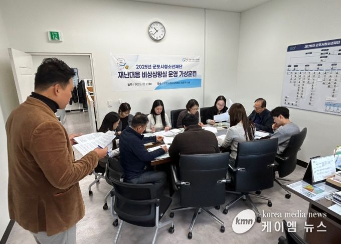 (케이엠뉴스) 12월 2일 군포시청소년수련관 4층 대표이사실에서 군포시청소년재단 대표이사와 안전감사팀, 경영기획실 직원들이 참석한 가운데 재난대응 비상상황실 운영 가상훈련을 실시했다.
