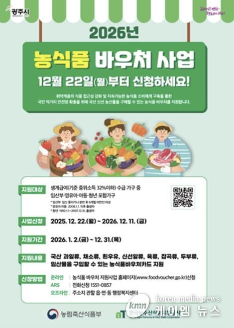 (케이엠뉴스) 광주시는 취약계층의 균형 있는 식품 섭취 지원과 지속가능한 농식품 소비 기반 확충을 위해 저소득 가정에 신선 농산물 구매를 지원하는 ‘농식품 이용권 사업’을 2026년 1월 2일부터 본격 시행한다고 17일 밝혔다.