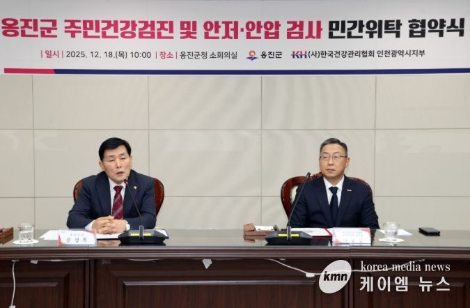 (케이엠뉴스) 옹진군은 12월 18일 한국건강관리협회 인천광역시지부와 ‘옹진군 주민 건강검진 및 안저·안압 검사 위·수탁 협약’을 체결하고, 주민 대상 종합건강검진 사업을 본격 추진한다.