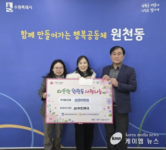 (케이엠뉴스) 지난 18일, 원천동에 소재한 송이비인후과는 지역사회 나눔 실천의 일환으로 원천동행정복지센터에 성금 50만 원을 기부했다.