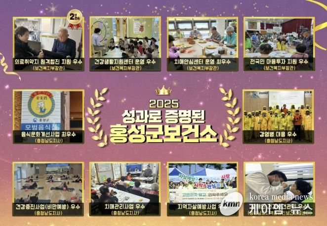 홍성군보건소는 2025년 중앙부처와 충청남도가 주관한 11개 분야 평가에서 우수기관에 선정되며 사업 기획력과 실행력을 동시에 인정받았다. 주요 수상내역으로는 ▲의료취약지 원격협진 지원사업 2년 연속 우수기관(보건복지부) ▲건강생활지원센터 운영 우수기관(보건복지부) ▲치매안심센터 운영 최우수기관(보건복지부) ▲치매관리사업 우수사례 공모전 맞춤형 사례관리 부문 우수상(보건복지부) ▲전국민 마음투자 지원사업 우수기관(보건복지부) ▲음식문화개선사업 평가 최우수기관(충청남도) ▲감염병 대응 우수기관(충청남도) ▲건강증진사업(비만예방) 우수기관(충청남도) ▲치매관리사업 우수기관(충청남도) ▲지역자살예방사업 우수기관(충청남도) ▲장애인 건강보건관리 우수기관(충청남도지역장애인보건의료센터)이 포함됐다.