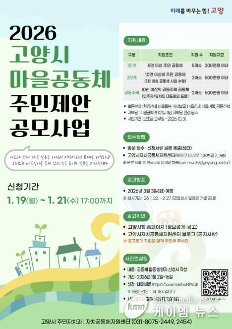 (케이엠뉴스) 고양특례시는 이웃과 함께 마을 활동에 참여하며 주민 스스로 지역 문제를 해결해 나가는 ‘2026년 고양시 마을공동체 주민제안 공모사업’에 참여할 공동체를 내년 1월 19일부터 모집한다고 밝혔다.