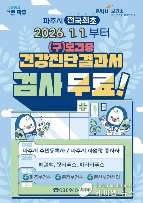 (케이엠뉴스) 파주시가 시민들의 보건 의료 접근성을 획기적으로 높이고 지역사회 감염병 예방에 앞장서기 위해 전국 지방자치단체 최초로 건강진단결과서(구 보건증) 발급 수수료를 전면 무료화한다.
