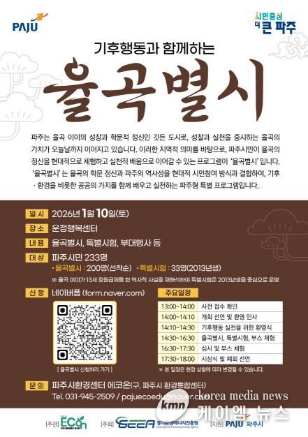(케이엠뉴스) 파주시환경센터 ‘에코온’은 파주를 대표하는 조선시대 사상가 율곡 이이의 학문 정신을 현대적 기후행동 가치로 재해석한 기후문화축제 ‘기후행동과 함께하는 율곡별시’를 오는 내년 1월 10일 운정행복센터에서 개최한다.