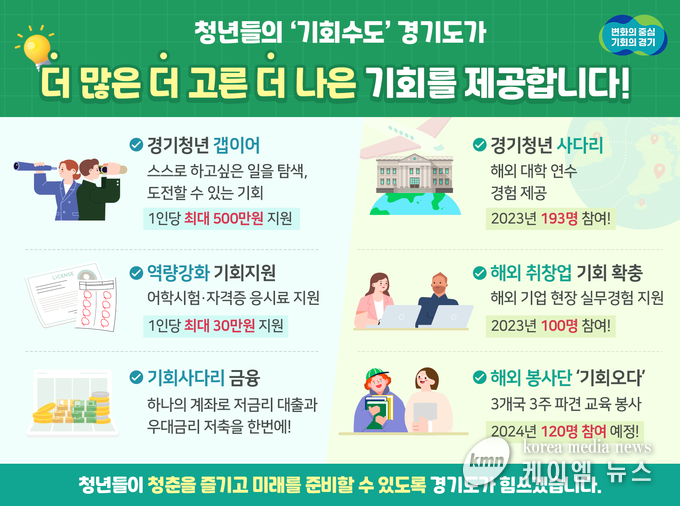 경기도는 내년 청년 해외대학연수·역량강화 기회 지원 58억 원, 청년 갭이어 55억 원, 청년 기회금융 593억 원, 청년 해외 취·창업 및 해외봉사단 36억 원, 청년노동자 지원 931억 원 등을 투입한다.