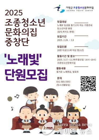 (케이엠뉴스) 가평군 조종청소년문화의집이 청소년들의 문화·예술 활동과 건강한 성장을 돕기 위해 노래빛 청소년중창단과 다양한 성장 프로젝트 참가자를 모집한다.